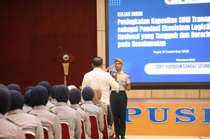 Tegal, Selasa, 16 Desember 2025 — Politeknik Keselamatan Transportasi Jalan (PKTJ) menyelenggarakan Kuliah Umum Staf Ahli Bidang Logistik dan Multimoda Perhubungan dengan menghadirkan Capt. Yufridon Gandoz Situmeang, SE., MM. Kegiatan ini dilaksanakan di Aula Puspita Kampus Perintis PKTJ, mulai pukul 08.30 WIB hingga selesai.