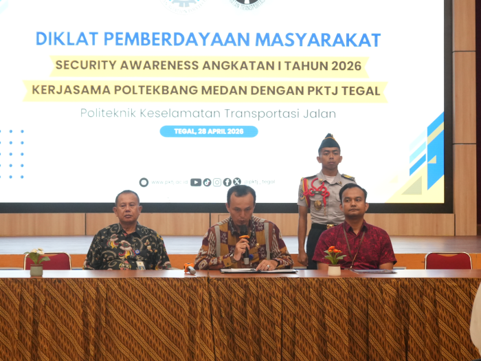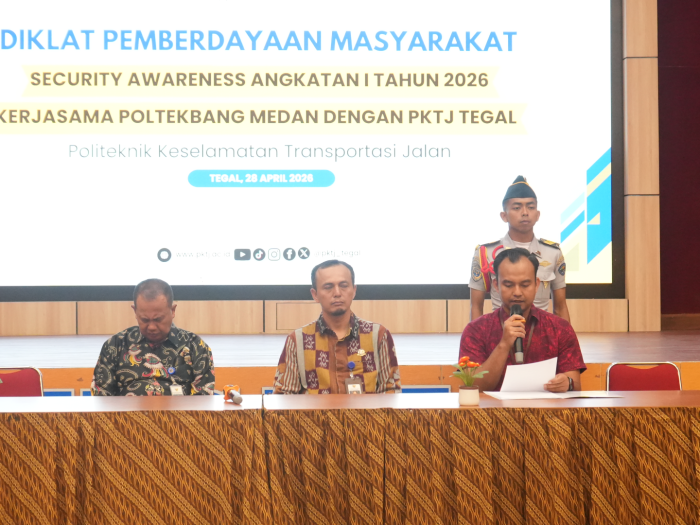 Tegal, 28 April 2026 — Politeknik Keselamatan Transportasi Jalan (PKTJ) bekerjasama dengan Politeknik Penerbangan Medan menyelenggarakan kegiatan Diklat Pemberdayaan Masyarakat Security Awareness Angkatan I Tahun 2026. Pembukaan DPM kali ini bertempat di Aula Puspita Kampus Perintis dan secara resmi dibuka oleh Kepala Bagian Keuangan, Umum, dan Kerjasama, Bapak Agus Hariyanto, S. Kom., M.Sc.