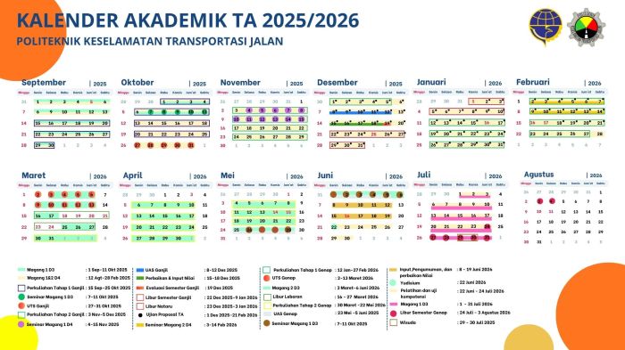 Dalam rangka menunjang kelancaran proses perkuliahan, bersama ini kami sampaikan Kalender Akademik Tahun Ajaran 2025/2026 sebagai pedoman bagi seluruh Taruna-Taruni dalam mengikuti kegiatan akademik di lingkungan Politeknik Keselamatan Transportasi Jalan.